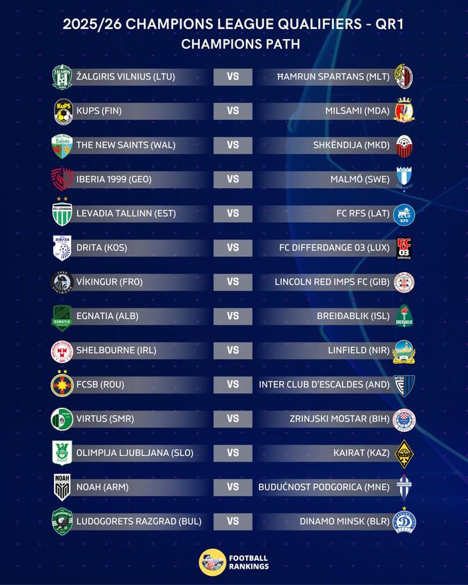 25/26赛季欧冠首轮资格赛抽签结束;两回合比赛将于7月进行