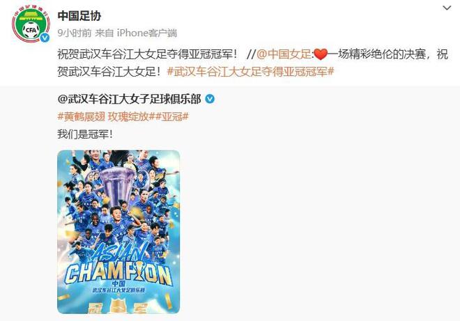 中国足协发文:祝贺武汉车谷江大女足夺得亚冠冠军!